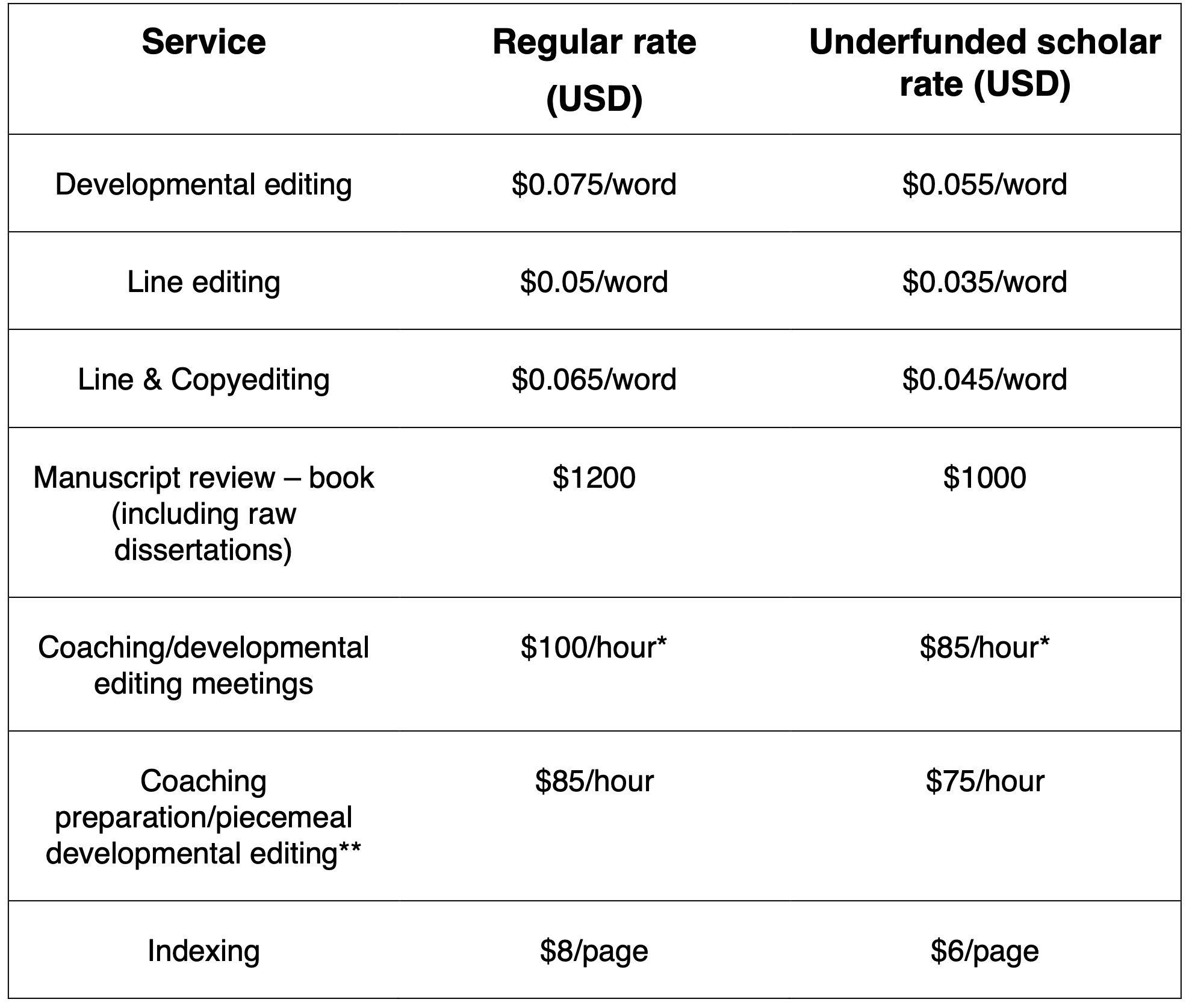 If you have access to institutional or grant funding for editing services, or if you are otherwise able to easily afford it, please use the full rate. If you are a writer or scholar in graduate school, in precarious employment, or otherwise facing financial barriers or insecurity, please use the underfunded scholar rate. Rate determination is based entirely on your self-assessment.